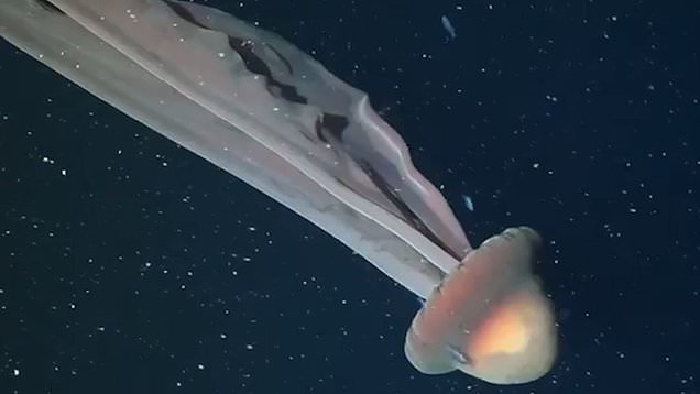 Eerie yet fascinating footage shows the 10-metre-long sea creature gently pulsing and swirling its way through the dark waters.