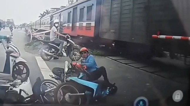 The driver crashes into fellow bike riders waiting behind the barriers on the other side (Picture: Jam Press)Accidents are frequent. In February a lorry driver was killed after his vehicle was hit by a train travelling through the city.On March 8,a motorbike rider was killed after trying to circumvent the safety barrier at a crossing.Hanoi’s famous Train Street carries railway vehicles several times a day on its single-track line.The narrow road is lined with shops and homes and is a popular attraction for visitors looking for an iconic photo grab.The distinctive railway line forms part of the north-south route through the city and was built under French colonial rule.