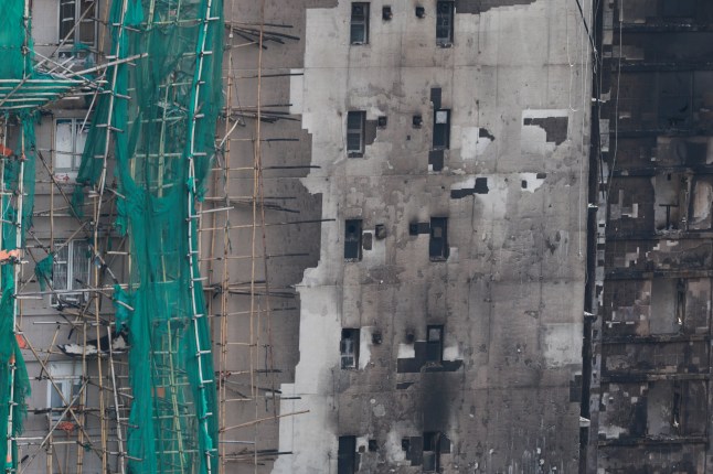 Bamboo scaffolding crumbles away from a building at Wang Fuk Court housing estate (Picture: Reuters)
